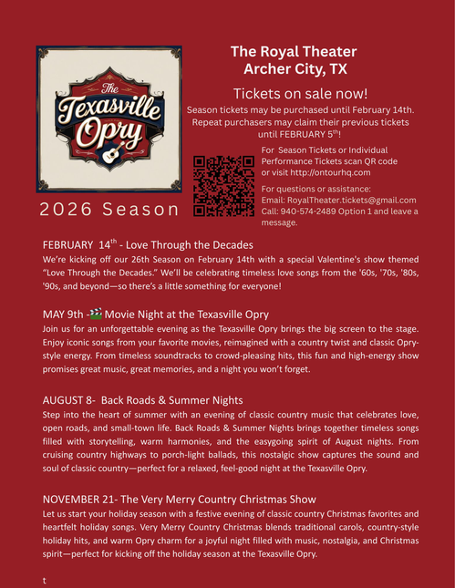 On April 2001, the Royal Theater Artistic Committee added The Texasville Opry, a live classic and traditional Country and Western venue to Archer City’s iconic theater schedule with a sold-out crowd. It has been a success ever since.